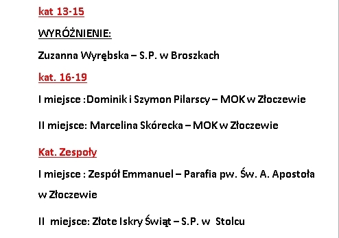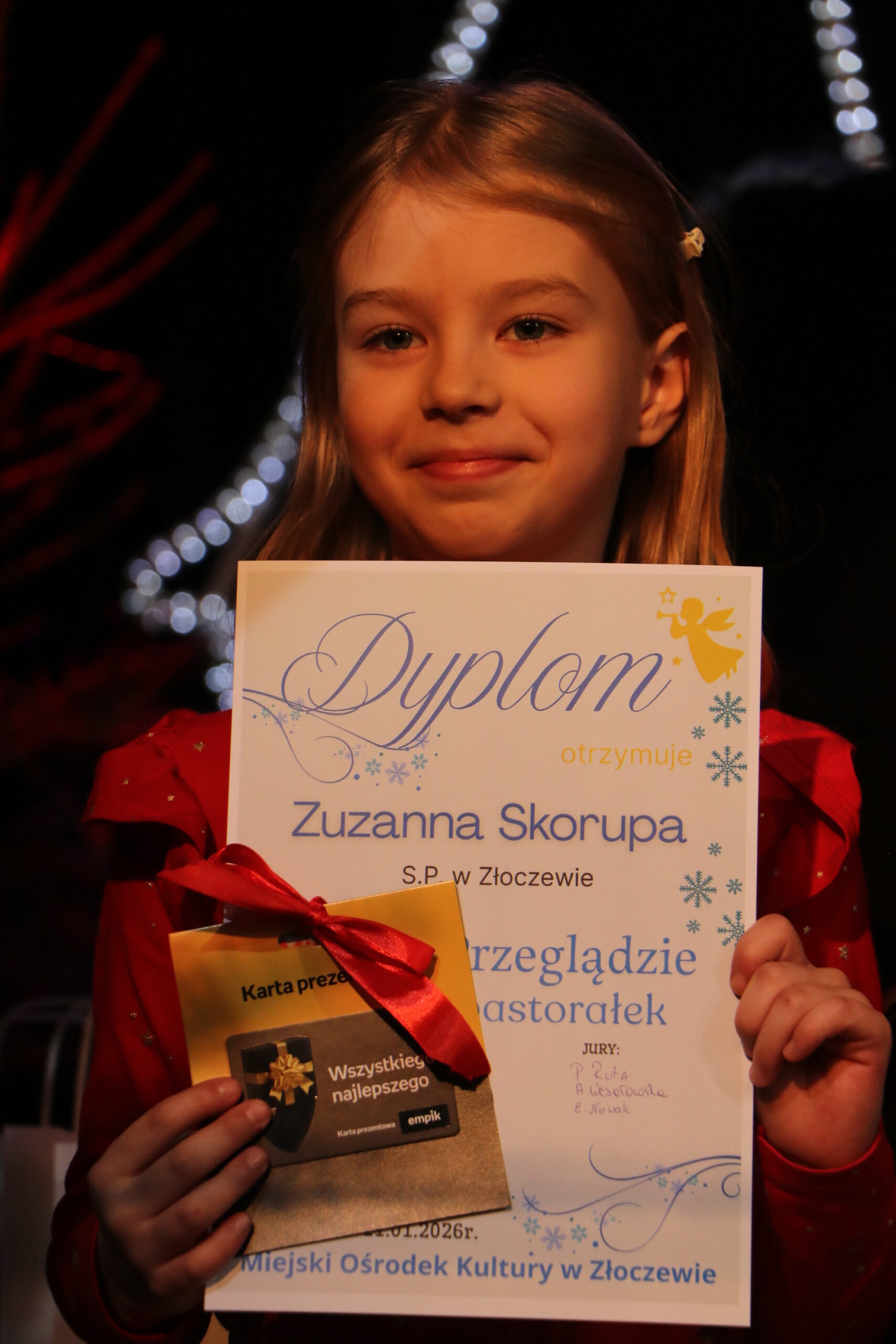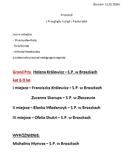 Za nami Przegląd Kolęd i Pastorałek. Dzieci i młodzież z naszej gminy za sprawą zaprezentowanych kolęd i pastorałek wprowadziła publiczność w świąteczny nastrój. Jury w składzie: Przemysław Ruta, Alfreda Wesołowska i Ewa Nowak przyznało miejsca i wyróżnienia w każdej kategorii wiekowej oraz nagrodę Grand Prix Przeglądu, którą ufundowała Radna Rady Miejskiej w Złoczewie, Pani Halina Żarnecka. Gratulujemy wszystkim wykonawcom oraz nagrodzonym.