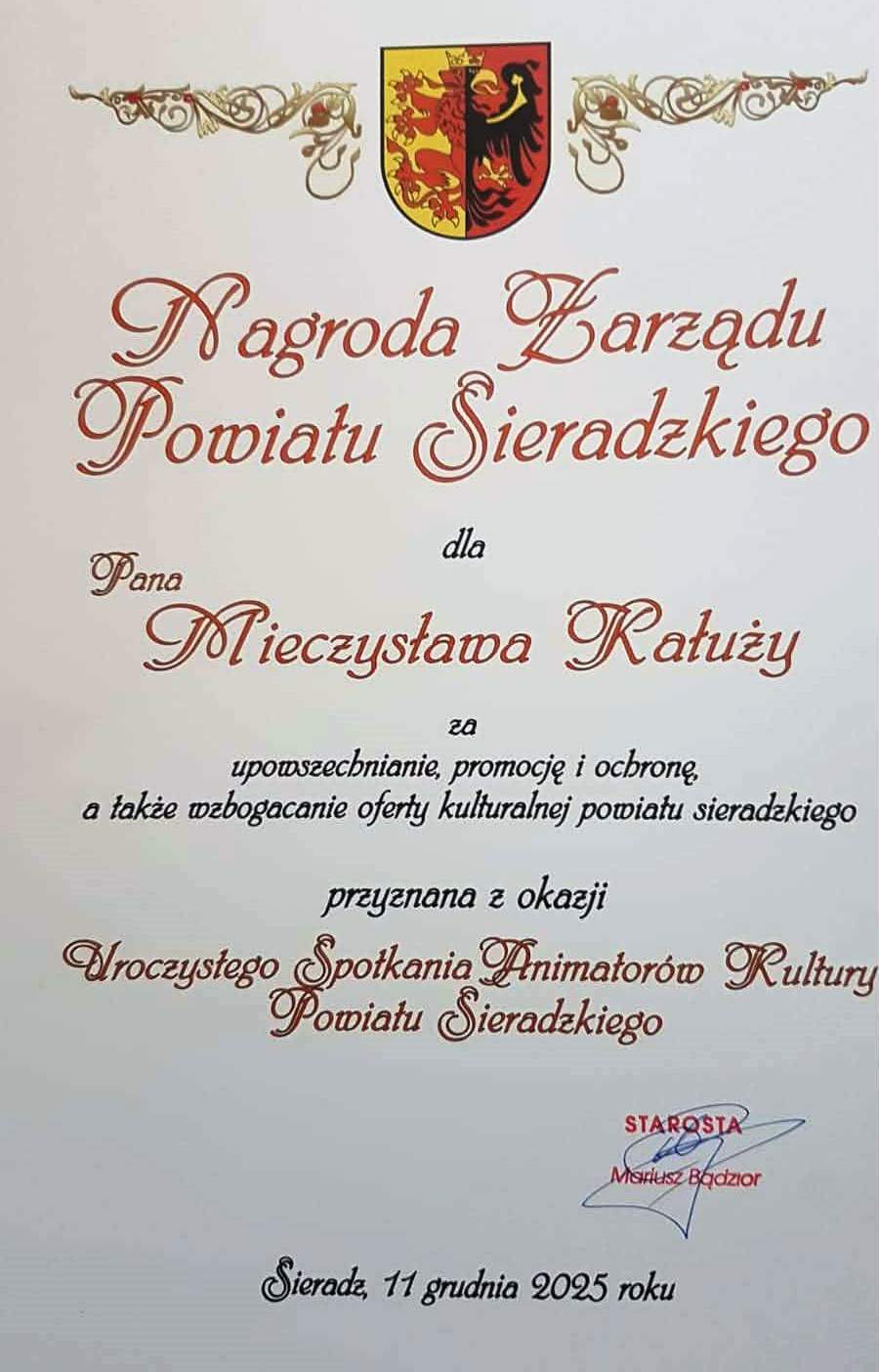 NAGRODA ZARZĄDU POWIATU SIERADZKIEGO DLA MIECZYSŁAWA KAŁUŻY